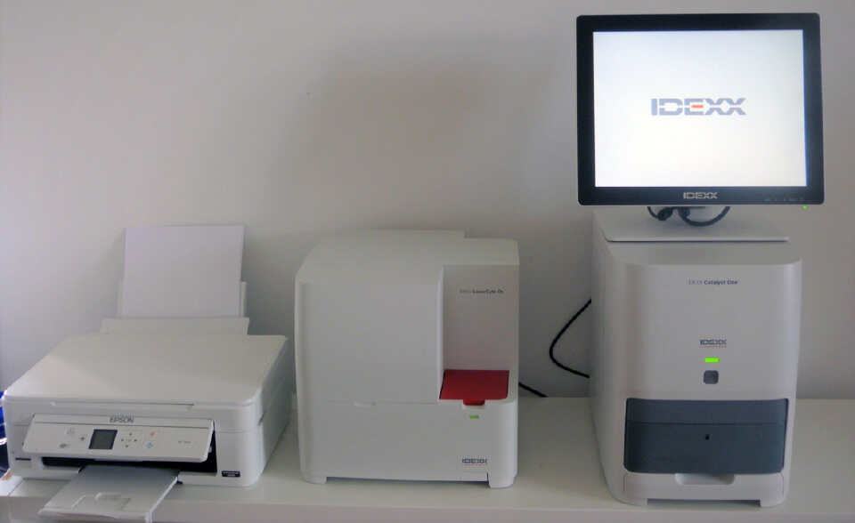Nous sommes équipés d’un laboratoire polyvalent de dernière génération, afin de réaliser les analyses de convenance et d’urgence : hématologie, biochimie, bilan de forme, cytologies diverses (thoracique, péritonéal…)…