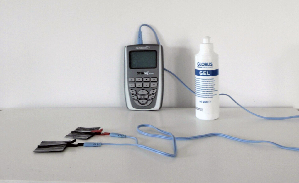 Nous sommes équipés du Stimvet 2000, le tout dernier modèle de la gamme Globus. C’est un dispositif d’électrostimulation par courant électrique dont les principaux objectifs sont de réduire la perception de la douleur et améliorer le renforcement musculaire. Les effets sont antalgique, vasomoteur, il stimule la fonction musculaire. Les indications sont variées comme les douleurs post-chirurgicales, les tendinites, les ténosynovites, l’arthrose, les escarres, les œdèmes, les plaies, l’amyotrophie et le renforcement musculaire ainsi que lors de muscles dénervés.